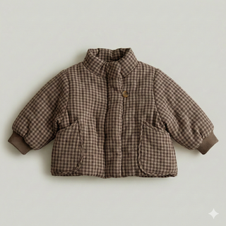 Chaqueta acolchada para niños y niñas con diseño de cuadros en tonos neutros, perfecta para el entretiempo y los días fríos.